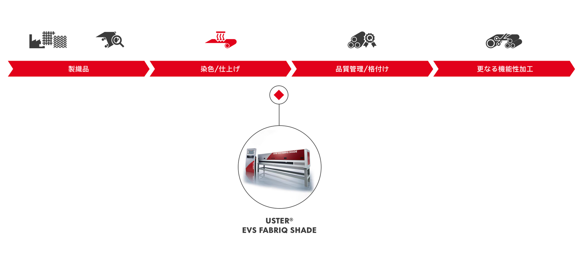 - Uster EVS Fabriq Vision との組み合わせによるワンステップ検査と色相・色差監視