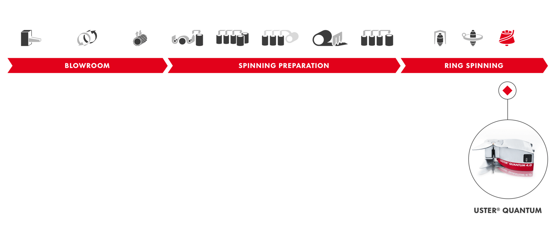 100% in-line monitoring includes Uster Quantum Expert and offers further optimization potential through connection to the platform Uster Quality Expert or Uster RSO 3D. This allows spinners to stay in control throughout the spinning process and to prevent issues at source.